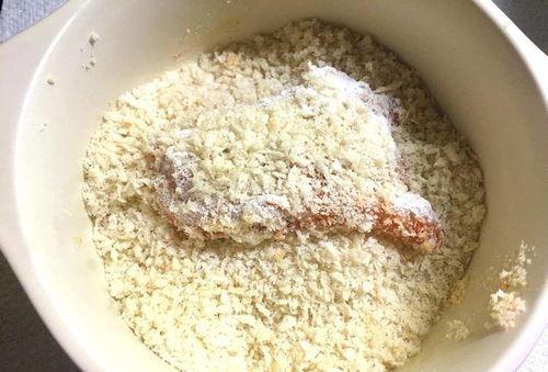 3. 裹面:将腌制好的鸡胸肉片裹上面糊,再裹上面包糠。